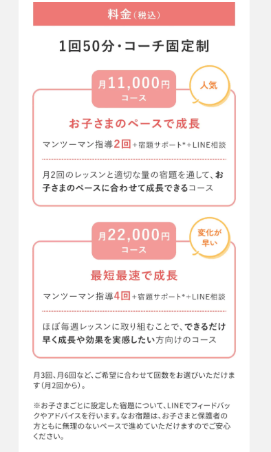 - 月謝…11,000円(レッスン月2回)or22,000円(レッスン月4回)※両コース宿題サポート&LINE相談付き